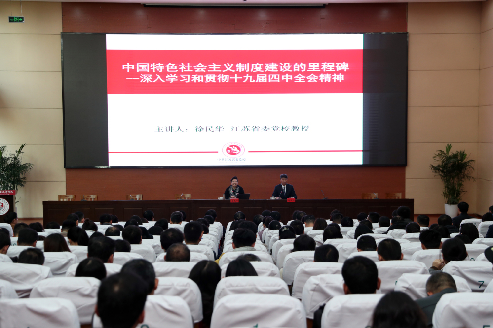 为深入学习宣传贯彻党的十九届四中全会精神,11月22日下午,江苏省委党校徐民华教授应邀为我校师生作党的十九届四中全会精神专题宣讲报告。在校校领导、全体中层干部、教职工党员及学生干部代表300多人现场聆听了报告会。校党委书记邵从清主持报告会。