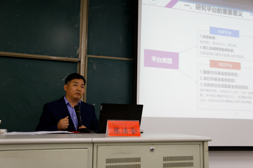 11月6日下午,盐城市社科联秘书长陈法金应邀来我校作“社科研究与智库建设”专题讲座。科技处、产教融合发展研究中心智库部分研究人员、各二级学院(部)分管科研工作领导、人文社科相关专业教师、马克思主义学院全体教师等到场聆听。会议由科技处处长王曙东主持。