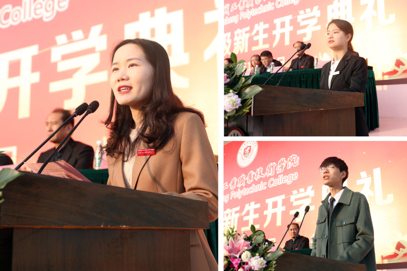 典礼上,建筑工程学院教师王静作为新生班主任代表发言,为同学们的大学生活提出三点建议:一是要志存高远;二是要脚踏实地;三是要崇德修身。信息与安全学院廖丽群同学作为老生代表分享了自己的大学学习和生活经验。建筑工程学院叶子轩同学代表全体新生向在校领导、老师、学长学姐们表示衷心的感谢,并从学会选择、学会学习、学会做人三个方面发言。徐梓铭、庄妍、汪昱池、郭蓉等四位同学作集体献词,代表全体在校生表达了“同心向党 奔赴远方”的承诺和“请党放心 强国有我”的决心。集体献词后,与会领导为八个二级学院的新生代表配发了校徽。