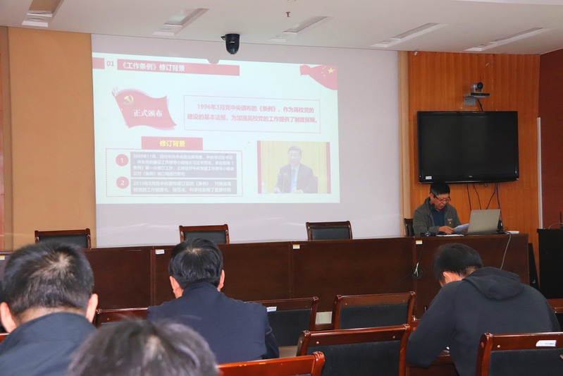 党课讲授前,机关党总支委员赵红军领学了习近平总书记关于高校党建工作的重要指示和今年2月26日召开的中央政治局会议精神。孙开进在党课中介绍了《中国共产党普通高等学校基层组织工作条例》修订的背景、意义和遵循原则,逐条逐句解读了新版《条例》的主要内容,并结合高校基层党组织工作的实际进行讲授。他指出,《条例》作为一部关于高等学校党建工作的指导性、规范性、纲领性文件,以习近平新时代中国特色社会主义思想为指导,以党章为依据,贯彻落实新时代党的建设总要求和新时代党的组织路线,全面规范了高校基层党组织工作,为新时代高校党建工作提供了根本遵循。《条例》的修订和实施,对于全面贯彻党的教育方针,落实立德树人根本任务,培养中国特色社会主义建设者和接班人具有十分重要的意义。他强调,机关党总支全体党员要深入学习领会《条例》,通过专题研讨、集中学习等形式,切实把党的建设融入教学、科研、管理和服务的全过程、各环节。