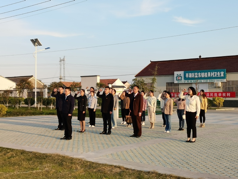在桂英村9.30广场,全体党员重温入党誓词,接受精神洗礼。大家表示要坚定信念,以更加饱满的热情投入到本职工作中。
