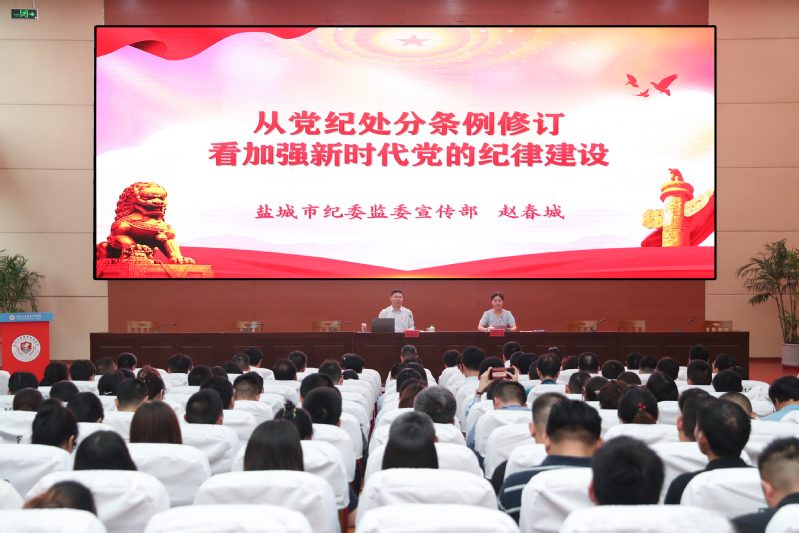 6月27日下午,学校在学术报告厅举办党纪学习教育读书班专题辅导报告会。盐城市纪委监委宣传部部长赵春城应邀作题为《从党纪处分条例修订看加强新时代党的纪律建设》的报告。纪委书记顾玉萍主持报告会。