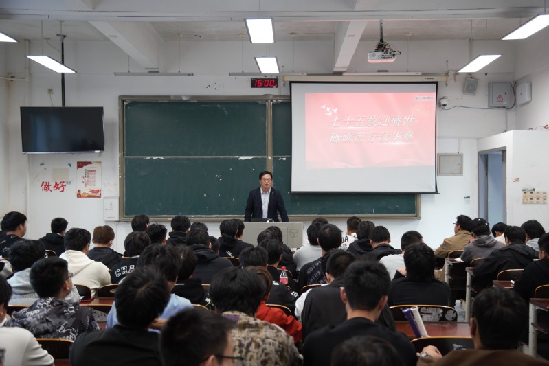 10月29日,校长刘玉申以《七十五载迎盛世 砥砺前行续华章》为题,为汽车与交通学院汽制2331、2332、2333班学生讲授“形势与政策”课。