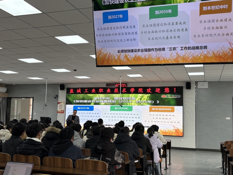 刘基以习近平总书记11月7日到广东梅州雁洋镇南福金柚种植基地察看柚子及其加工产品、文创产品为切入点,阐释为什么要建设农业强国,建设什么样的农业强国,怎样建设农业强国以及建设农业强国的盐城新实践,以生动详实的案例启发引导学生,回应学生现实关切,进一步激发学生的爱国情怀和使命担当。
