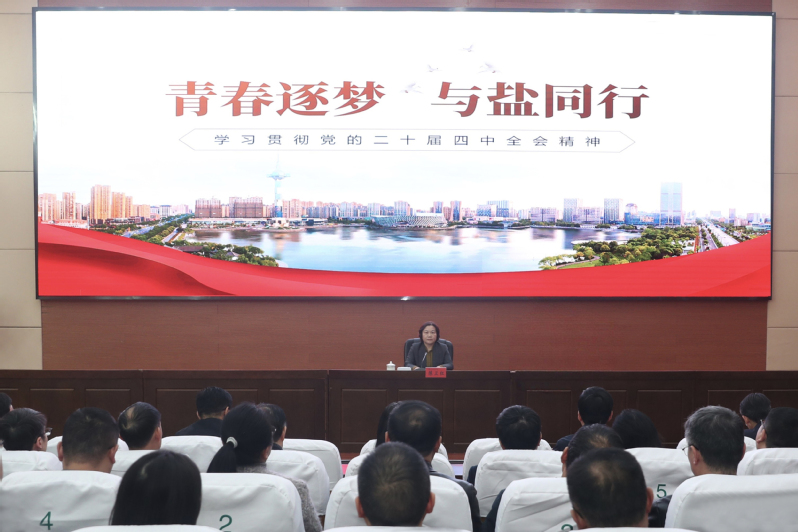陈卫红以“青春逐梦 与盐同行——学习贯彻党的二十届四中全会精神”为主题,全面宣讲党的二十届四中全会精神,从全会丰富内涵与核心要义、盐城实践成果和青年成长担当等三个方面进行了深入浅出的授课,并就师生普遍关心的教育高质量发展、青年就业等内容进行了充分解读。